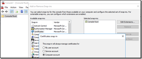 Avataan MMC-konsoli mmc komennolla Suorita -ikkunasta. Lisätään Certificates laajennus File valikosta Add Remove Snapin valinnan avulla. Certificates snap-in ikkunassa valitaan Computer account.